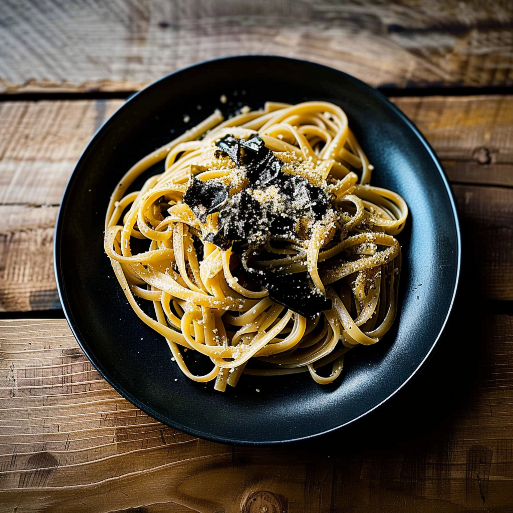 Savory Black Garlic & Miso Pasta with Seaweed Crumble