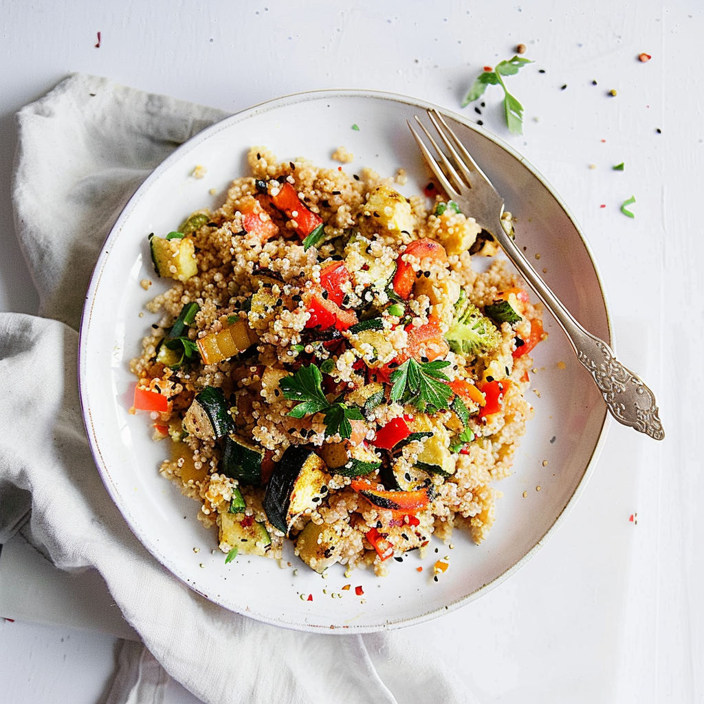 Delicious Warm Harissa-Roasted Vegetable & Quinoa Bowl