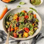 Combine everything: Once everything’s cooked and cooled slightly, mix the quinoa with roasted veggies in a large bowl. Drizzle fresh lemon juice over the top along with finely chopped herbs before serving.