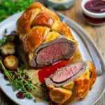 Let it rest before slicing into this glorious masterpiece! Each cut reveals layers of tender beef surrounded by savory mushroom filling embraced by flaky pastry—pure bliss!