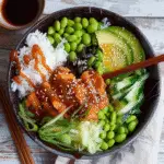 - Assemble the Bowl: Place a scoop of rice in each serving bowl. Top with marinated salmon, edamame, green onions, and seaweed salad if using. Drizzle with Sriracha mayo.