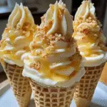 There’s nothing quite like the creamy, dreamy delight of Banana Pudding Cheesecake Cones. Imagine biting into a crunchy cone filled with layers of smooth banana pudding and velvety cheesecake, all topped with whipped cream and a sprinkle of crushed vanilla wafers. It’s the dessert that makes you feel like a kid again while still impressing your adult taste buds.