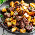 Combine & Serve!: Once both components are ready, serve hot! Arrange crispy potatoes alongside juicy steak bites on a platter. Drizzle any leftover marinade over everything for extra flavor punch.