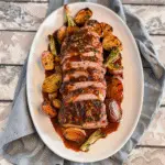 Add Everything to the Oven: Place the seared pork loin in the center of your vegetable-lined tray. Drizzle half of your glaze over the pork before roasting everything together.