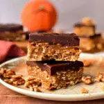 Keywords: For variety, substitute pumpkin puree with mashed sweet potato or butternut squash. To make vegan-friendly, use maple syrup instead of honey and ensure chocolate is dairy-free. Store leftovers in an airtight container in the refrigerator for up to one week or freeze individually wrapped bars for up to three months.