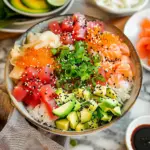 Key toppings include sliced cucumber, radish, avocado, seaweed salad, pickled ginger, and your choice of protein—be it sashimi-grade salmon or marinated tofu! Drizzle soy sauce or spicy mayo over top to tie all those flavors together into one delicious bite.