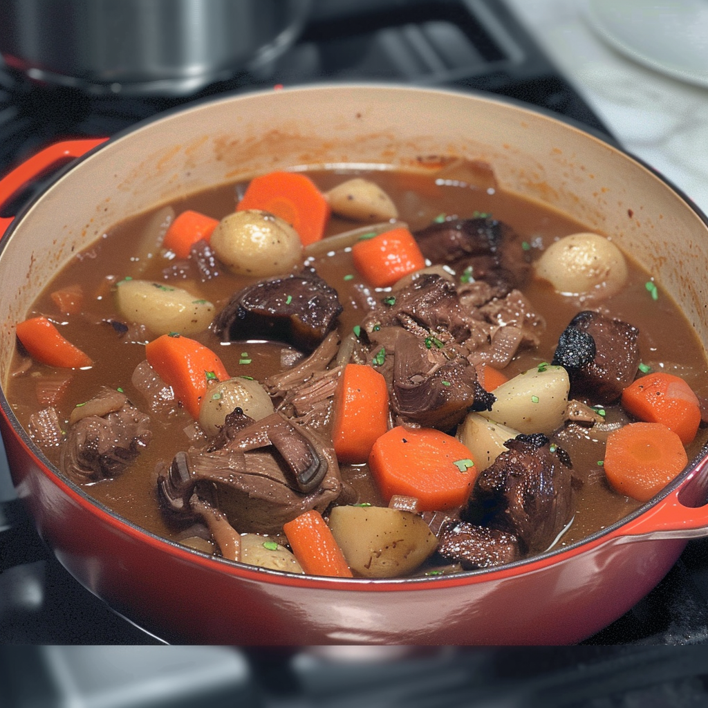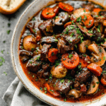 Keywords: Marinate the beef overnight in red wine for enhanced flavor. Feel free to customize by adding pearl onions or different herbs like rosemary. Store leftovers in an airtight container for up to three days.